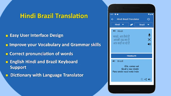 Oplev nem og præcis sprogkonvertering med "Hindi Brazil Translation". Fra hindi til portugisisk er denne app en avanceret oversætter og rejseordbog, der præsenterer ordlister for alle dine kommunikationsbehov.