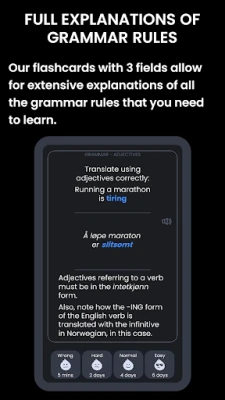 Mjølnir Norwegian er en sprogindlæringsapp designet til norsk. Den kombinerer lærebogskvalitet, smartphone-interaktivitet og effektiv memorisering. Perfekt for udlændinge i Norge, der ønsker at mestre udtale, grammatik og ordforråd for flydende kommunikation.